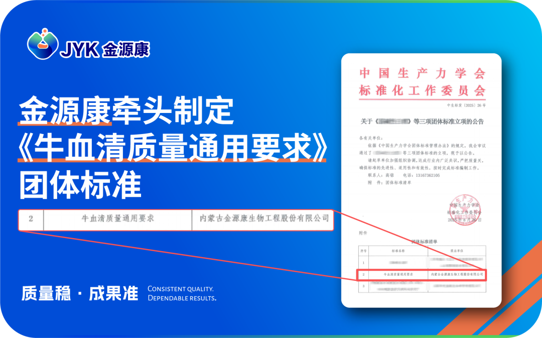一纸公告,牵动行业目光。中国生产力学会标准化工作委员会(中体标发26号)正式公告,《牛血清质量通用要求》团体标准成功立项。作为该标准的唯一牵头起草单位,金源康生物的名字赫然在列。