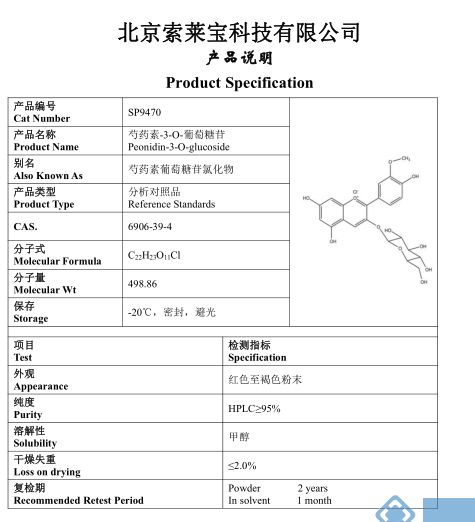 芍药素-3-O-葡萄糖苷标准品-常用生化试剂-试剂-生物在线